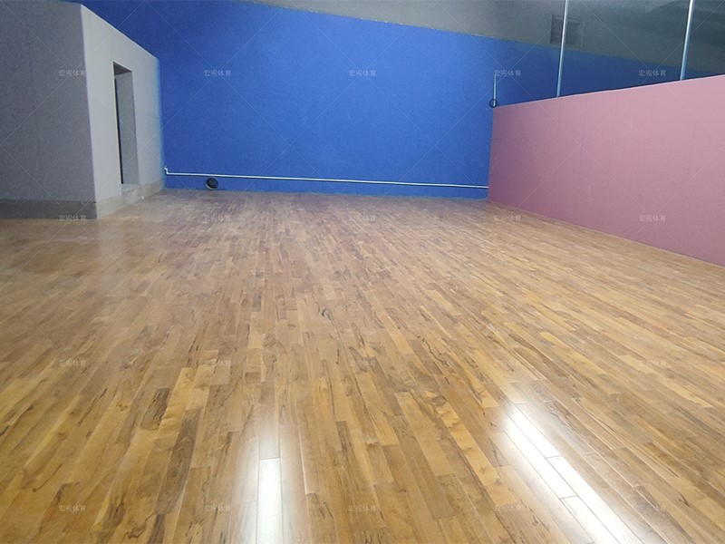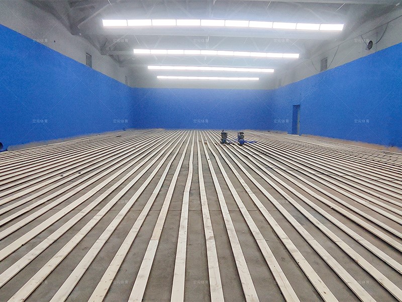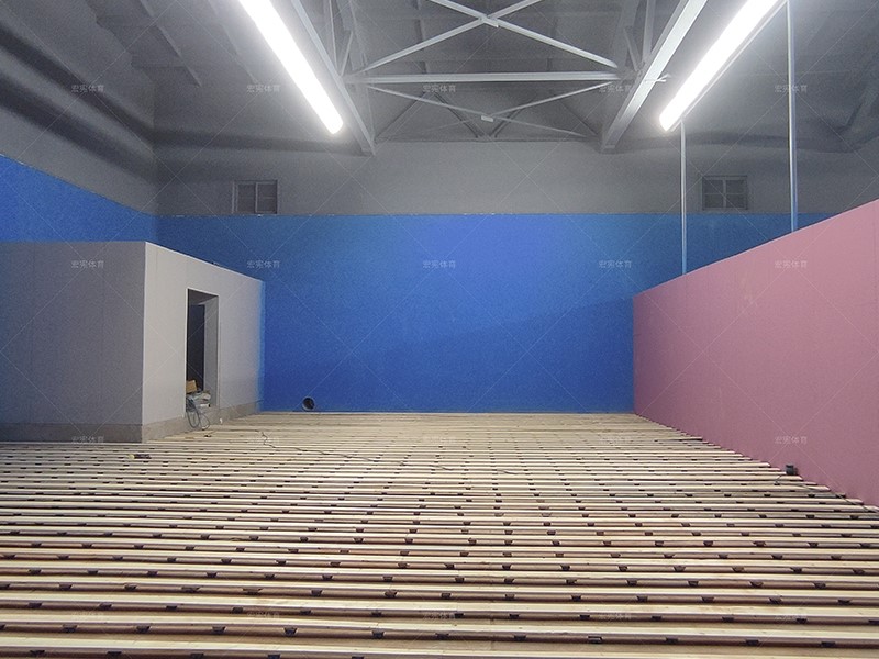 場(chǎng)地整體鋪完在運(yùn)動(dòng)長(zhǎng)條燈光的映襯下,加黃色的面板和深藍(lán)色的墻體搭配的更加貼合,可以很好的起到放松運(yùn)動(dòng)員視力的作用